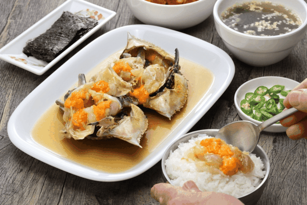 - Ganjang Gejang – Cua ngâm tương: Cua tươi ủ trong nước tương, tỏi, ớt, đường, thấm vị mặn ngọt đặc trưng, ăn kèm cơm trắng càng ngon.