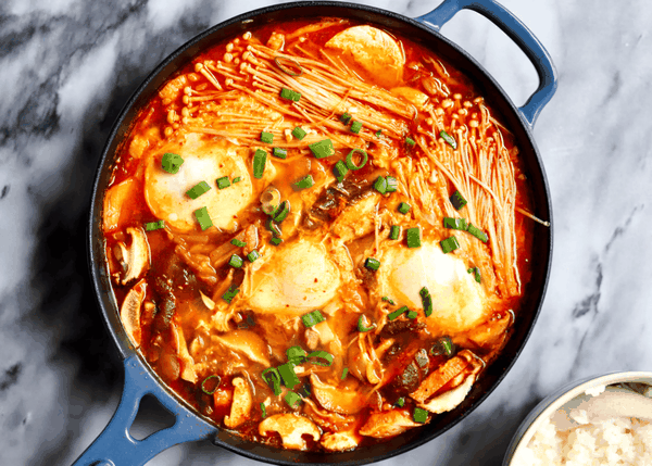 - Sundubu Jjigae – Súp đậu phụ cay: Tô súp nóng hổi với đậu phụ non, hải sản, thịt và tương ớt cay nồng, cực hợp vào ngày lạnh.