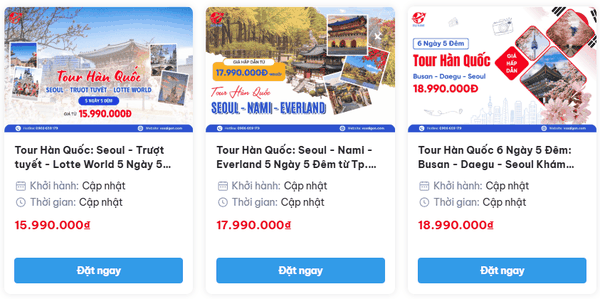 Nếu bạn muốn khám phá ẩm thực và văn hóa Hàn Quốc một cách trọn vẹn, VSG Travel mang đến những tour du lịch Hàn Quốc trọn gói với mức giá hấp dẫn. Hành trình được thiết kế chuyên nghiệp, bao gồm vé máy bay, khách sạn, ăn uống, tham quan những địa điểm nổi tiếng và thưởng thức đặc sản địa phương. Liên hệ ngay để tận hưởng chuyến đi tuyệt vời cùng VSG Travel!