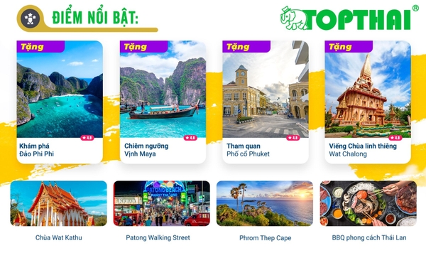 Tour Đảo Phi Phi 4 Ngày 3 Đêm cùng VSG Travel – Hành trình khám phá thiên đường nhiệt đới tuyệt đẹp tại Thái Lan. Thưởng ngoạn cảnh sắc ngoạn mục tại Laem Promthep View Point, khám phá nét cổ kính của phố cổ Phuket với kiến trúc Bồ Đào Nha. Vui chơi sôi động tại phố đi bộ Patong Walking Street nổi tiếng thế giới. Đắm mình trong vẻ đẹp thiên nhiên kỳ diệu của đảo Phi Phi – một trong những hòn đảo đẹp nhất thế giới. Ghé thăm đền Chalong, biểu tượng Phật giáo linh thiêng của Phuket. Một chuyến đi không thể bỏ lỡ!